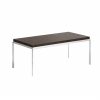 Square coffee table with thick melamine tabletop and dark grey steel base